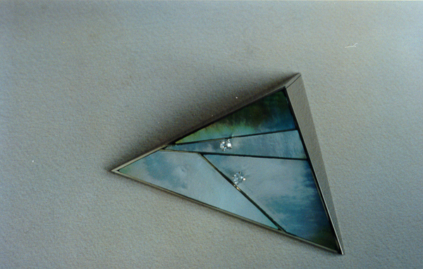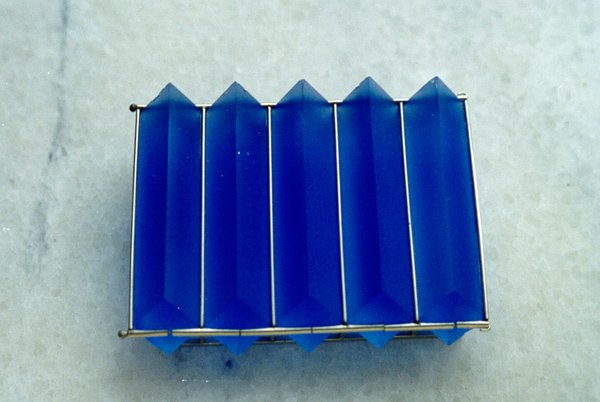 Яркий пример тому – брошь из серии “Ритм”. Она строится по принципу четырёхгранной призмы в лёгкой металлической рёберной конструкции. Металл здесь выступает буквально как линия, что явилось первой причиной, по которой композиция броши воспринимается графической в самом строгом смысле этого слова, хотя цвет и варьируется. К тому же, рёберные плоскости призм и впитывают, и отдают свет, умножая тем самым цветовые нюансы, особенно при разных ракурсах его рассмотрения.