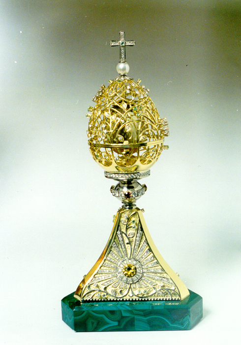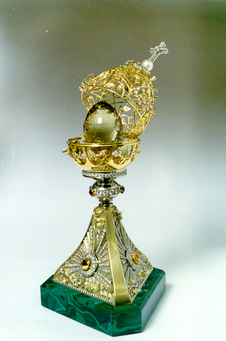 Пасхальное яйцо. 1994. Жёлтое золото, белое золото, бриллианты, изумруды, гранат, цитрин, малахит, жемчуг.