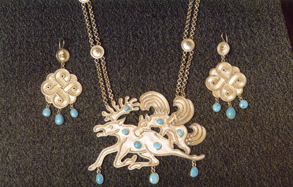 Гарнитур из серии "Предания старины далёкой" (подвес, серьги). 1993. Серебро, бирюза.