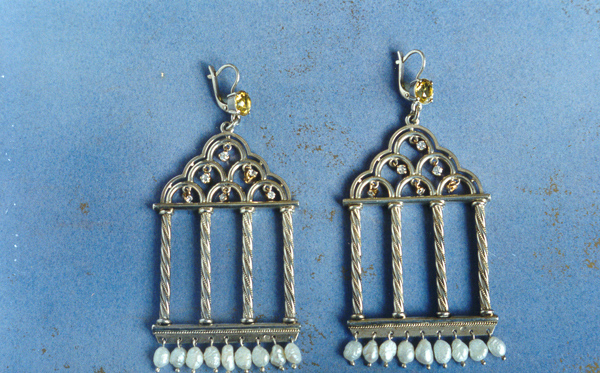 Серьги "Ярославна". 1995. Серебро, золото, цитрин, фианит, жемчуг.