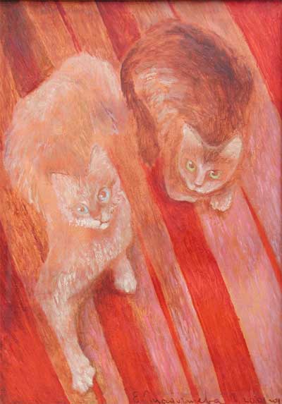 Кошки» шелк, гор. батик, 84х60, 2001г. |